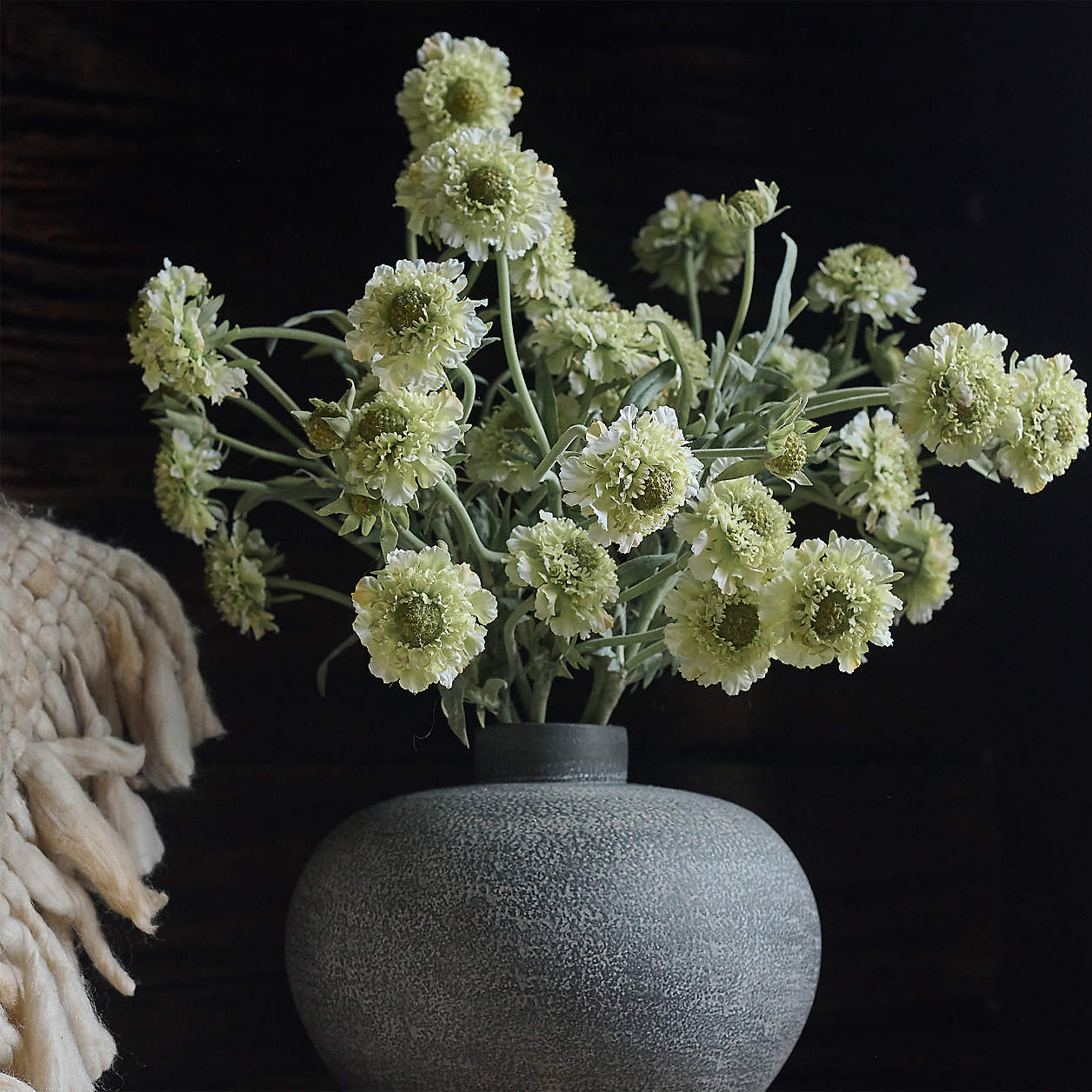 This faux scabiosa stem has all the shaggy, naturalistic beauty of the real thing—so lifelike you'd swear it was just plucked from a garden. Supported on slim stems along with angular leaves, layers of luxurious petals surround the spiky centers of the delightful pincushion flower. Mix and match with our other Abigail Ahern stems to build a gorgeous fresh-from-the-garden faux bouquet that lasts and lasts.