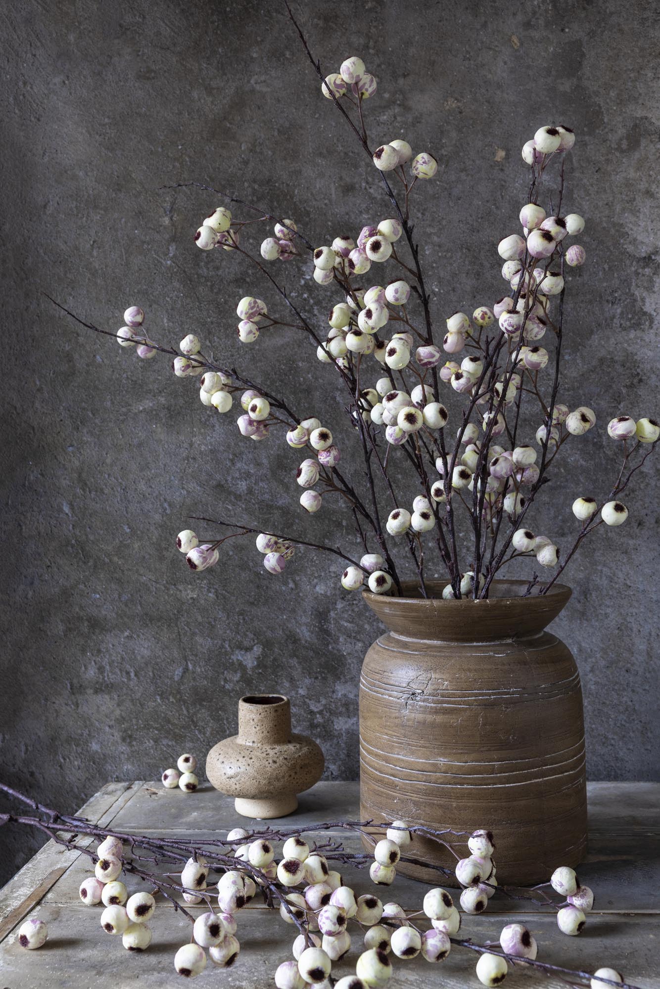 Sold as a single stem, it has that quirky, sculptural silhouette only berries can bring. Drop a few into a tall bottle-neck vase for instant botanical chic, let them stand proud on a mantle, or mix them into a wild arrangement for a touch of effortless elegance. Equal parts striking and sophisticated, it’s the kind of stem that makes a room feel styled without even trying.