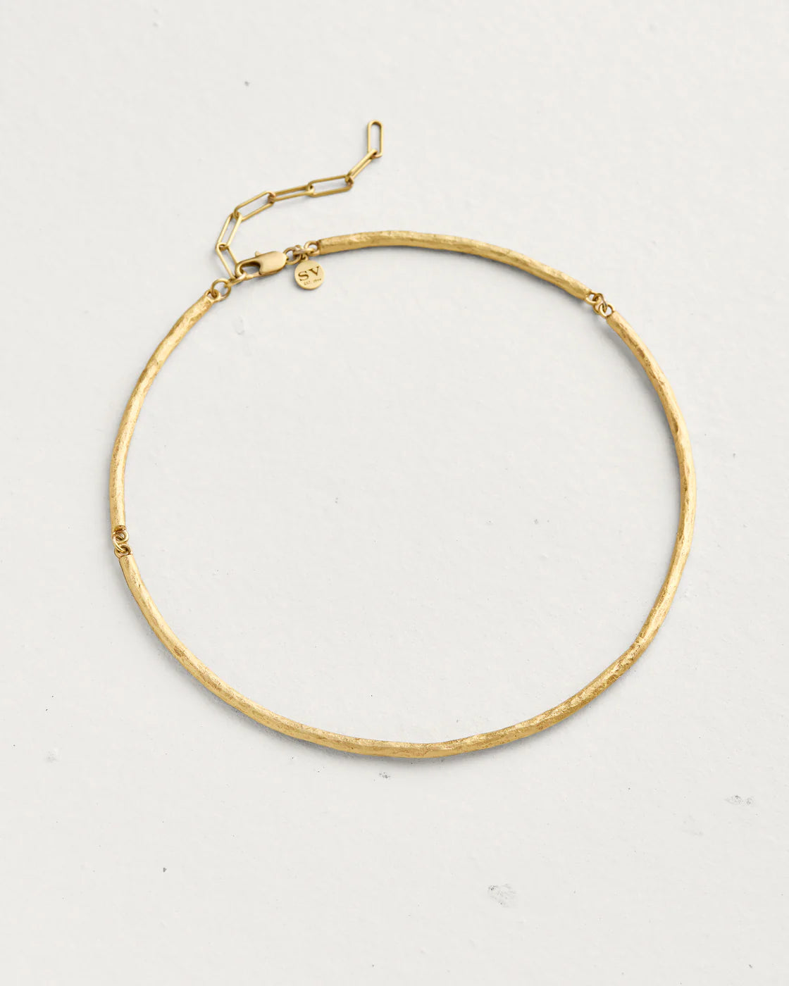 Shaped from recycled brass with the textured look of metal kissed by the sea, this weathered hinged collar is summer’s statement piece. Modern, chic, and a little bold—it’s the kind of necklace you save for your best days. Finished with an anti-tarnish coat for lasting wear, it measures 17 ½" around (5 ⅜" diameter) and includes a 3" extender for the perfect fit.