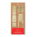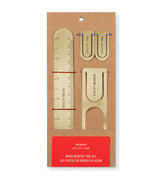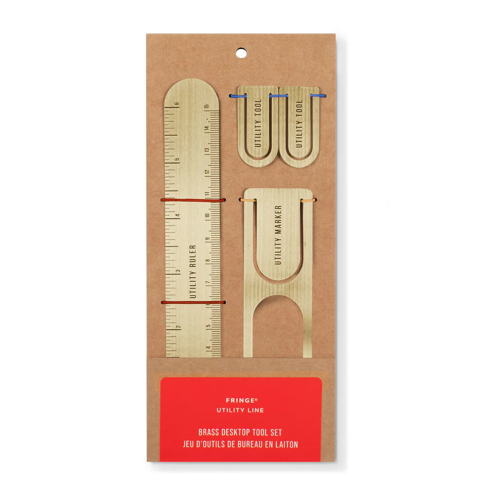 Laser cut brass desktop tool set with engraved details. Includes a 6" ruler, bookmark, and 2 clips. This design was inspired by utilitarian styles and analog details, with a focus on function and durability.