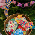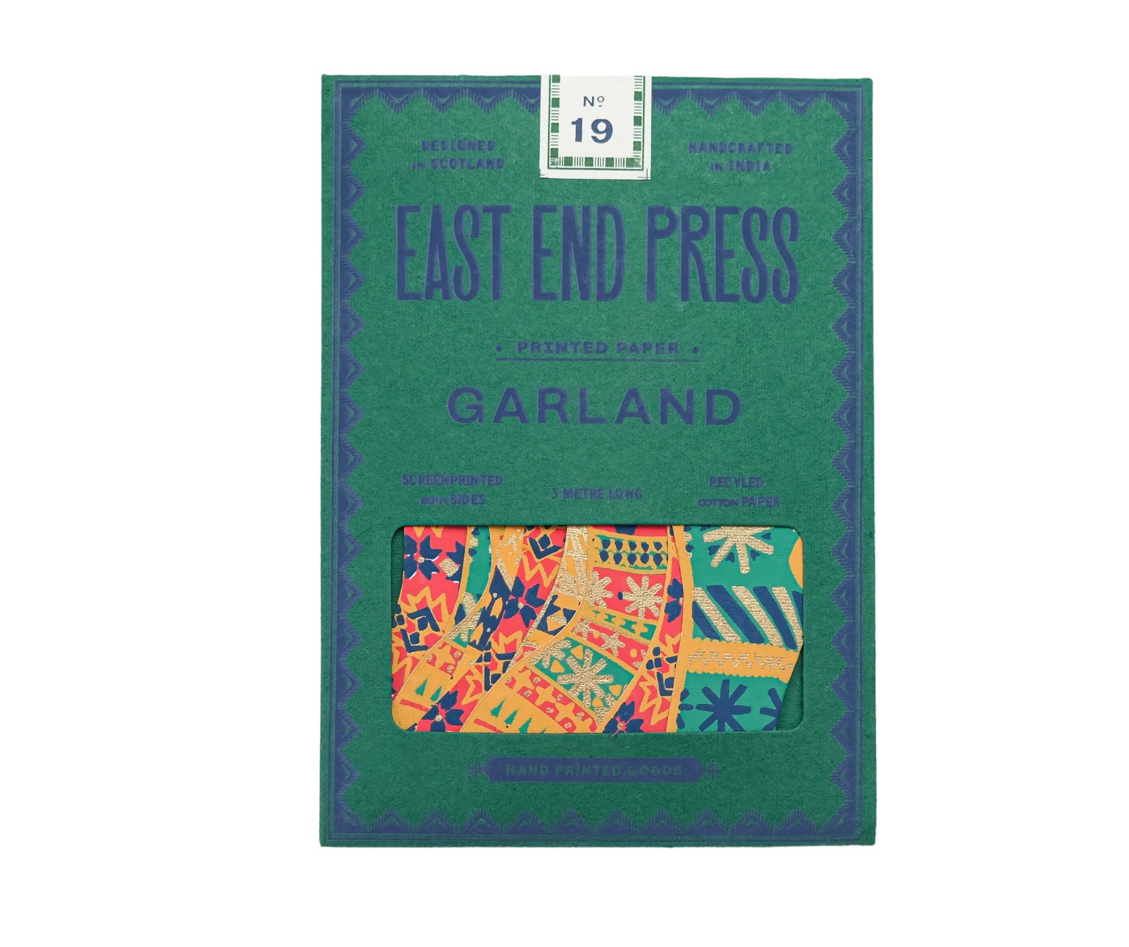Bring a dose of festive cheer to your mantel with this delightfully eclectic garland — ten patterned stockings strung along eight playful feet. Each cotton paper stocking is screen printed by hand on both sides, so the charm carries through at every angle. Sewn onto sturdy cotton thread and made from recycled materials, it’s a whimsical, earth-friendly way to deck the halls.