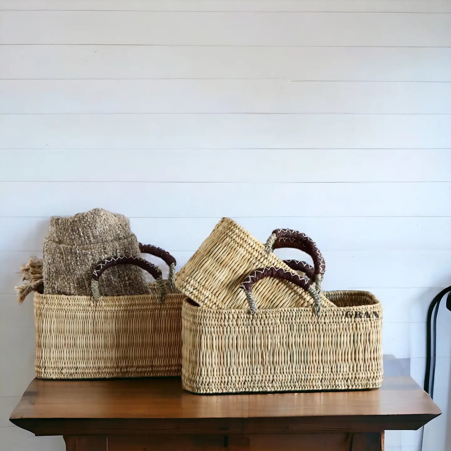 Handwoven Moroccan baskets made from natural reed with stitched leather handles—earthy, useful, and full of character. Perfect for market days, storing textiles, or adding texture to a room. Available in three graduated sizes, each handmade in Morocco with subtle variations.