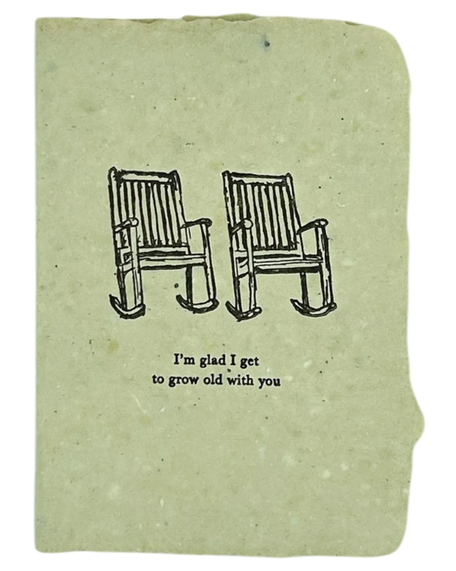 Card features an illustration of two rocking chairs and reads "I'm glad I get to grow old with you".