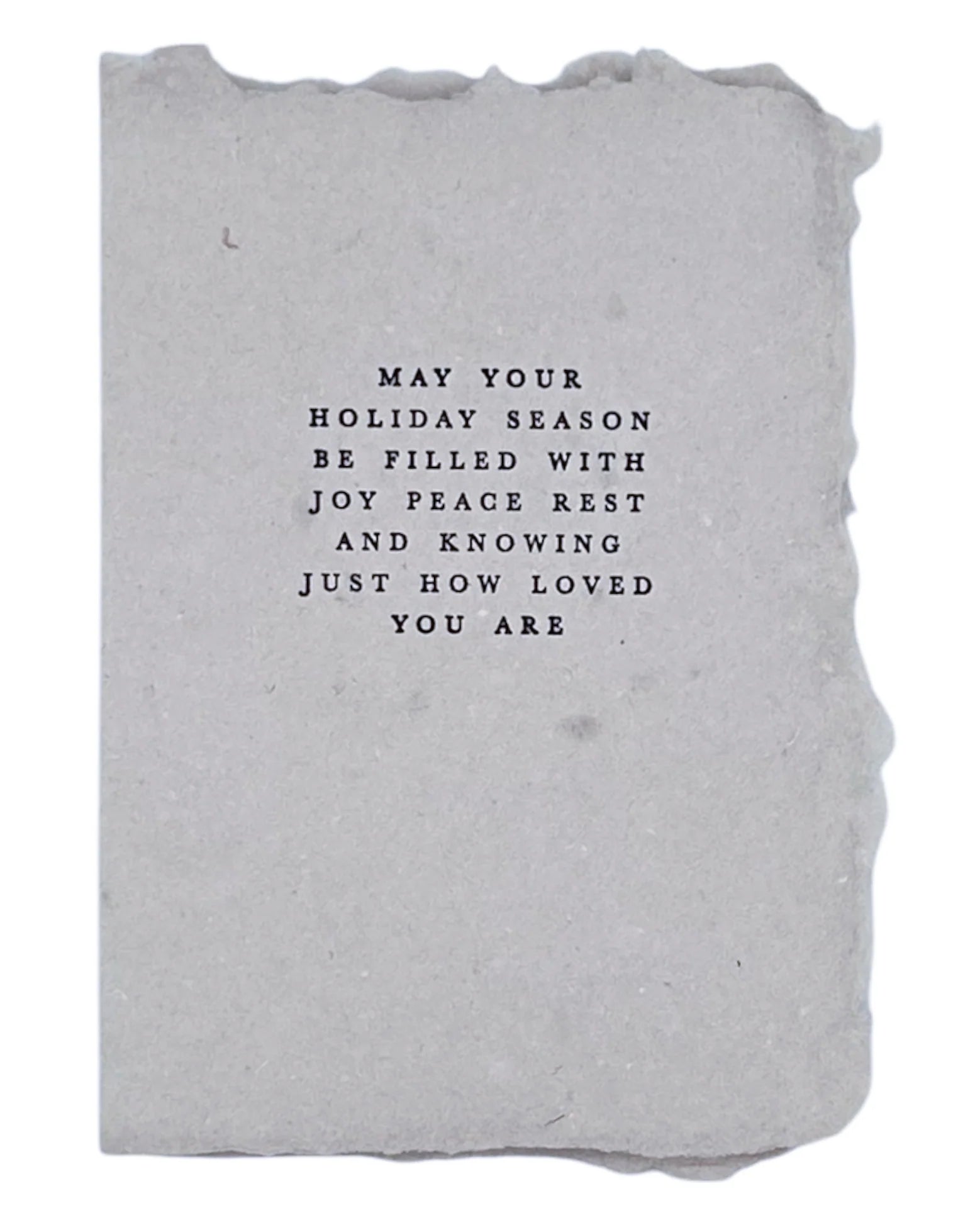 Handmade paper card with four full deckled edges, hand folded with inside blank.
