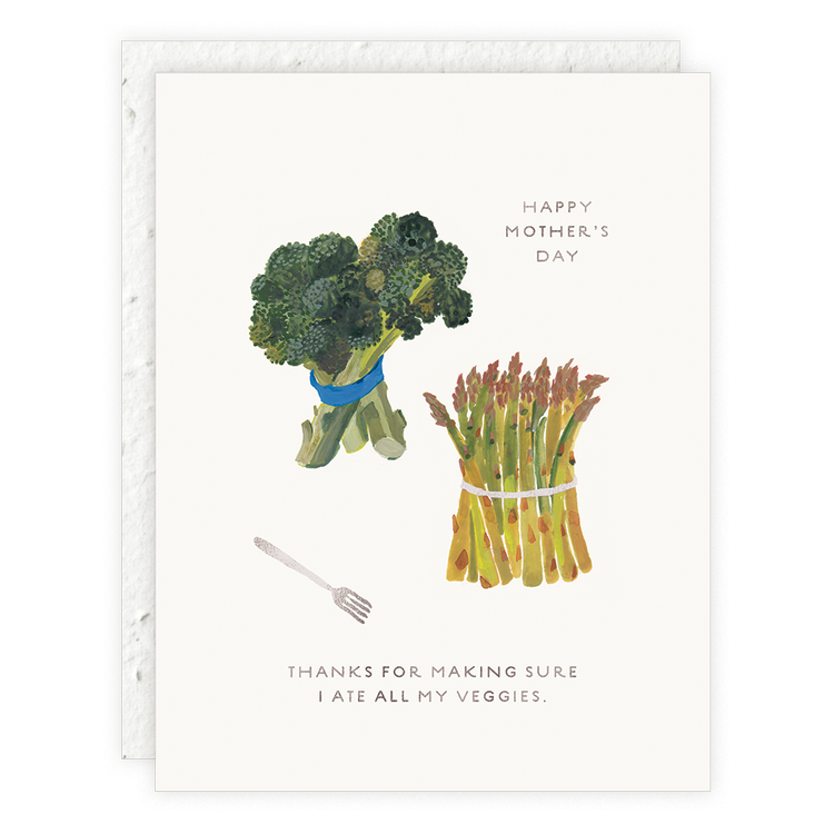 Celebrate Mom with more than flowers — this playful “Eat Your Veggies” card blends cheeky gratitude and botanical charm. Featuring foil‑stamped style, a blank inside for your own message, and a seed‑paper envelope she can plant afterward, it’s the perfect mix of fun + function.