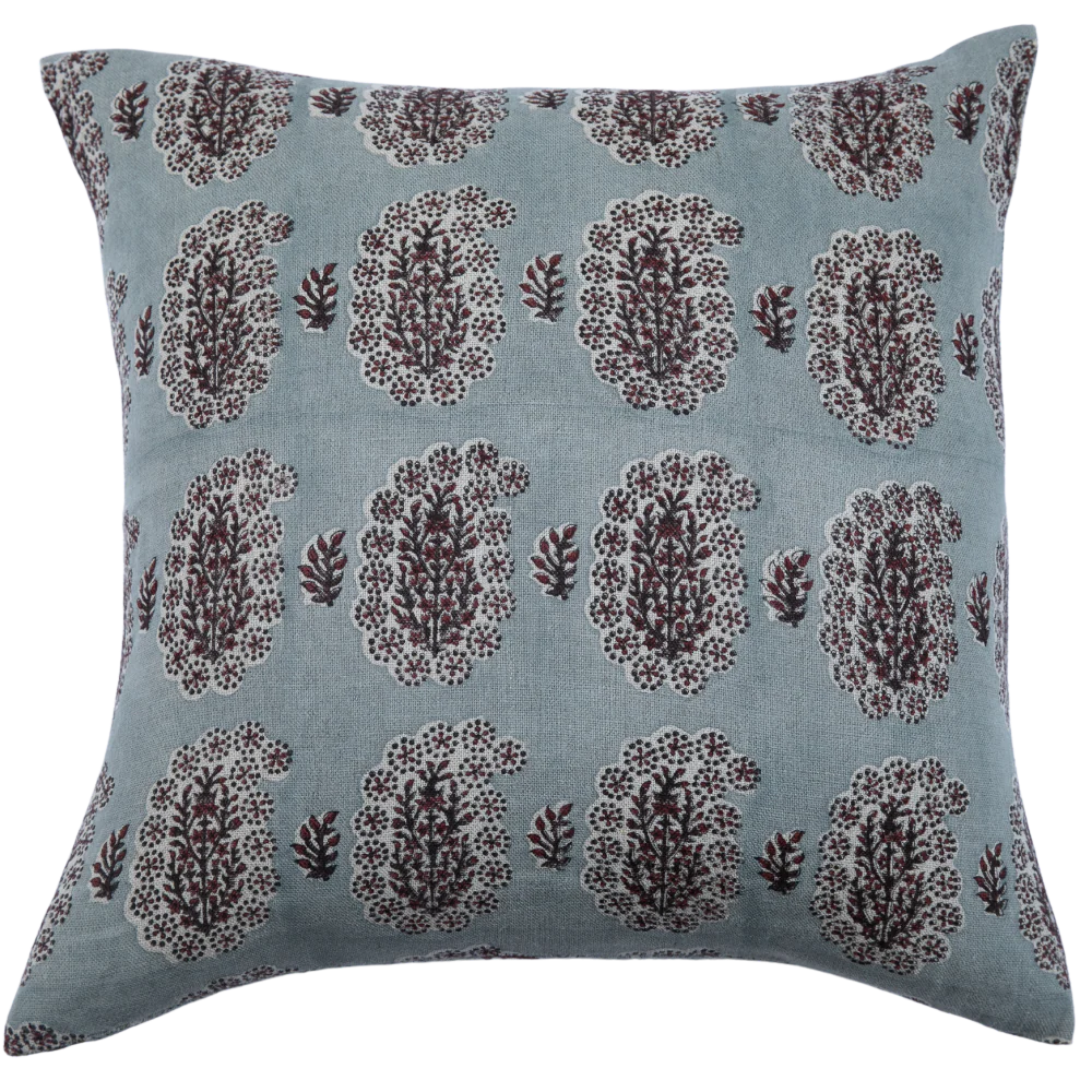 A striking 20" x 20" double-sided block print pillow featuring a serene sky-blue base and an intricate eggplant, paisley-inspired pattern. Hand-printed for rich texture and artisanal charm, each pillow has subtle variations that make it truly unique. Insert is included, so it’s ready to style the moment it arrives. A perfect pop of color and pattern for your sofa, bed, or favorite reading chair.