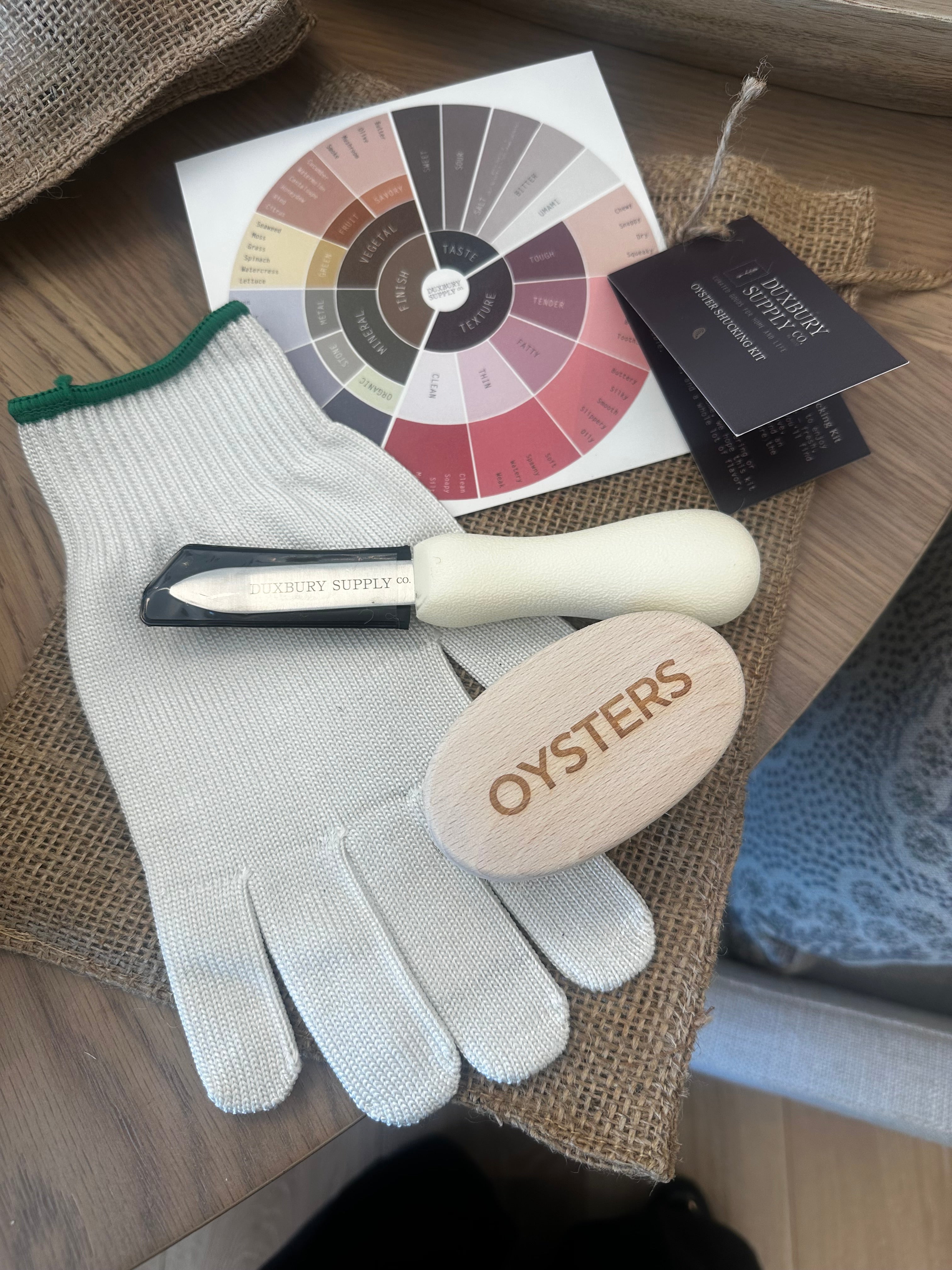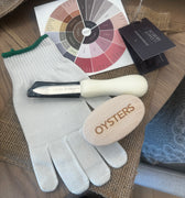 All you need for an oyster affair—our trusty shucking knife, protective glove, natural bristle brush, and our signature flavor wheel for tasting like a pro. Perfect for seaside feasts or a quiet dozen at home—briny, charming, unforgettable.