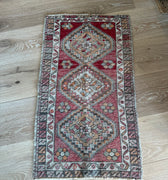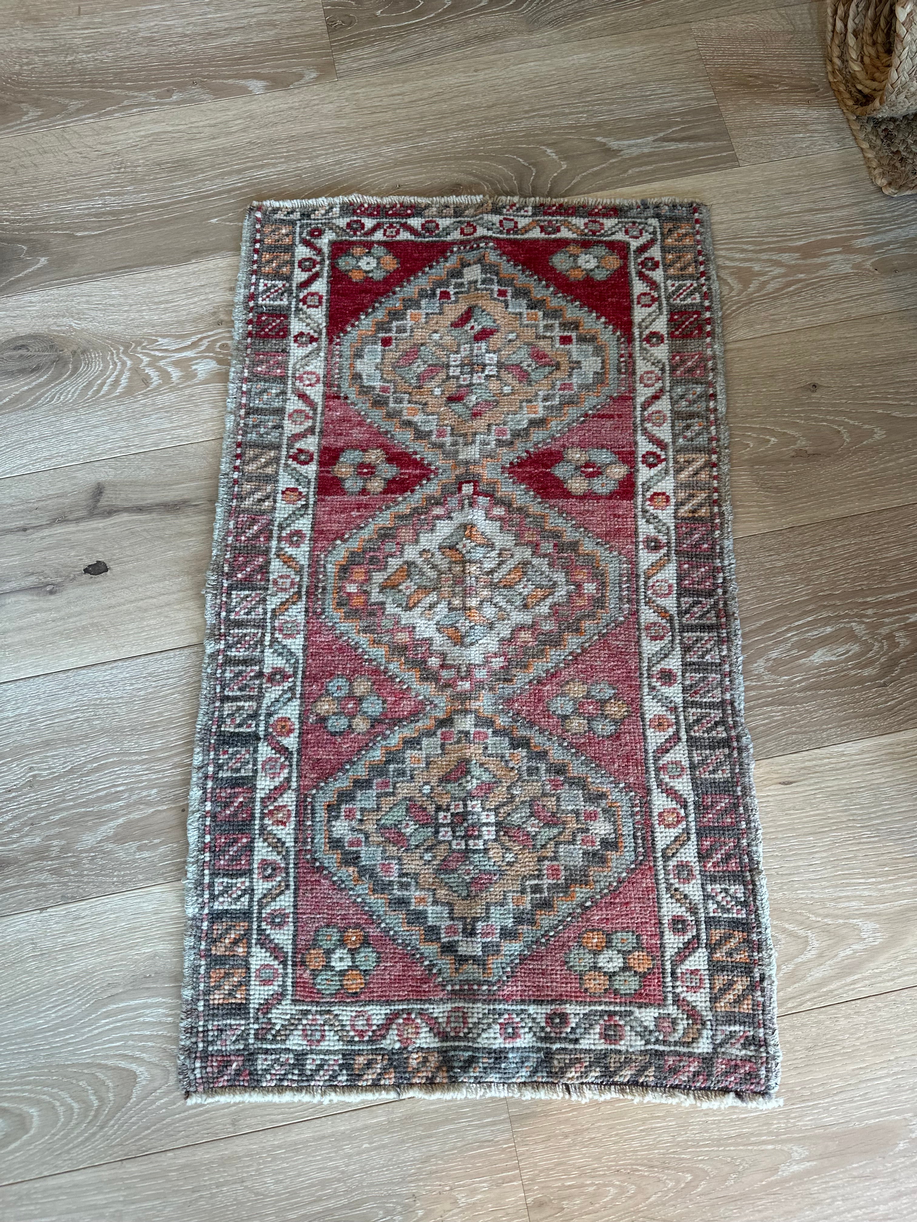 A petite vintage Turkish rug with plenty of soul. Handwoven in rich, time-softened wool, its intricate patterns and sun-faded hues tell tales of centuries-old craftsmanship. Perfect as a layered accent—at the bedside, in the kitchen, or in a small hallway, this mini brings a touch of nomadic charm wherever it lands.