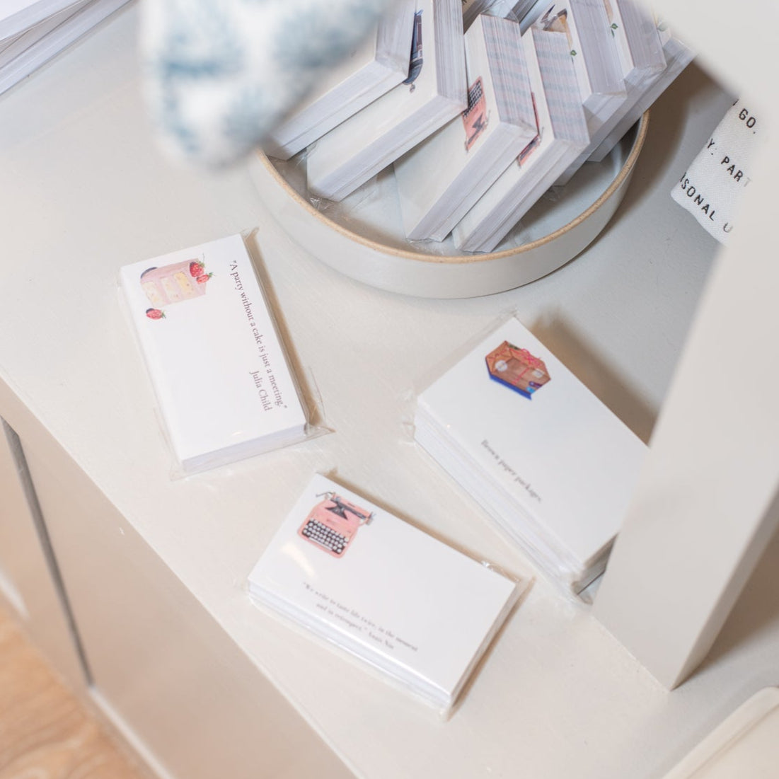 Petite cards, big charm—these 3.5 x 2″ calling cards feature a whimsical cake slice and cheeky Julia Child quote. Perfect for notes, gift tags, place settings, or slipping into a card with a little XO. Thirty-five thick, luxe cards come tucked in a cello bag with a sweet sticker—ready to sprinkle a little everyday delight.