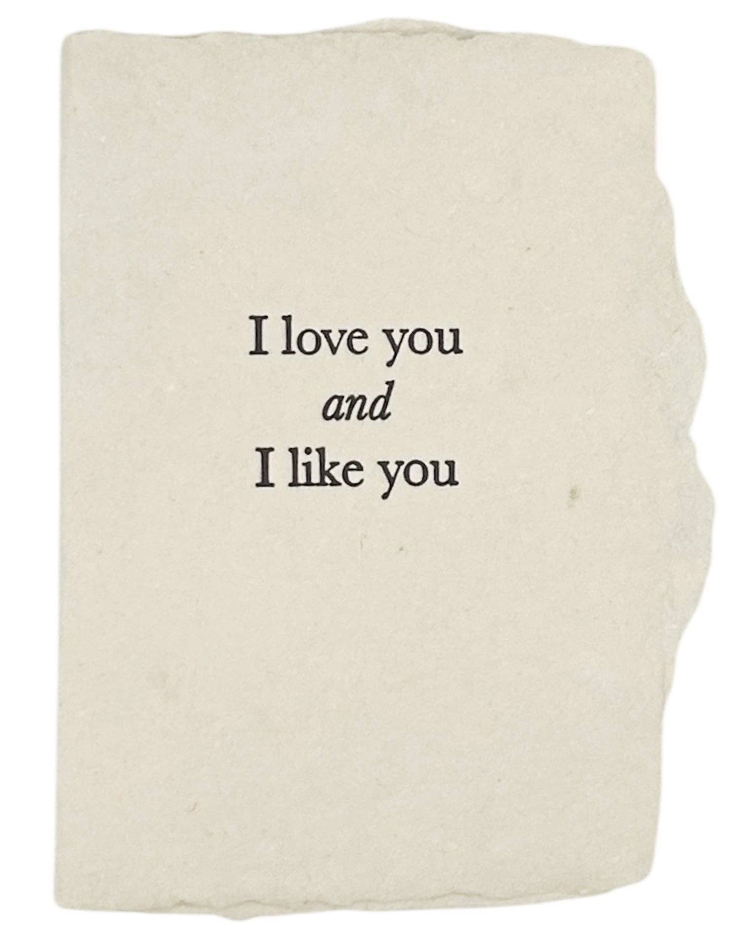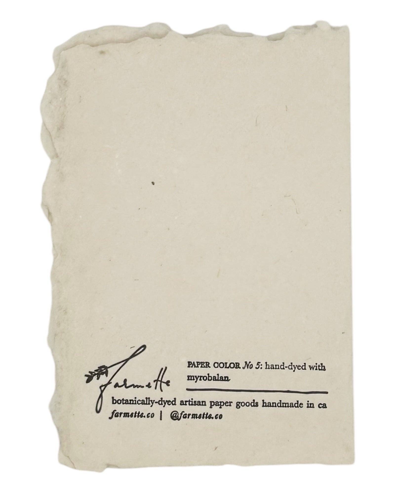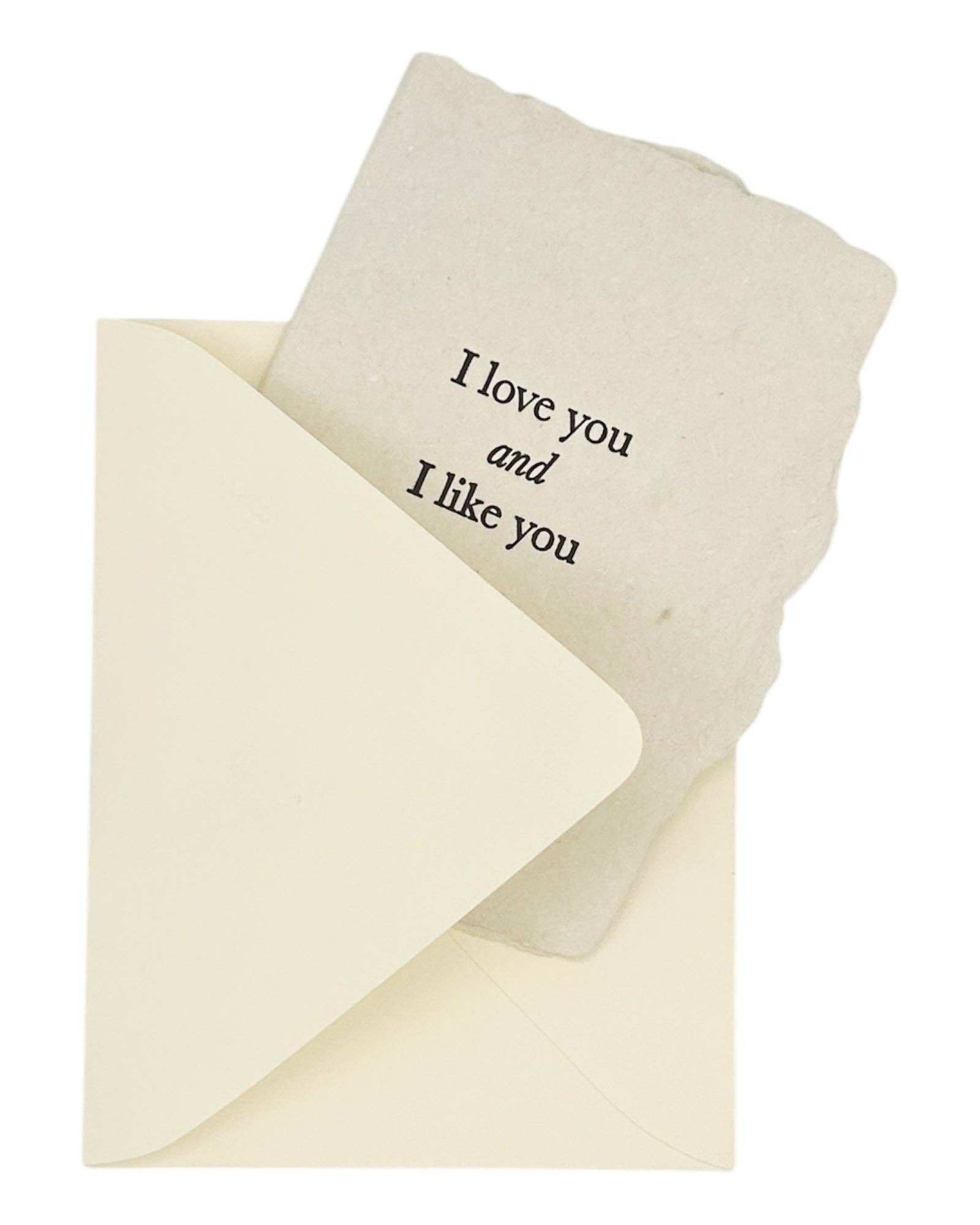 Beautiful handmade paper cards, letterpress printed one-at-a-time with light-hearted sweetness for someone you love. Full deckle edge paper handmade in our California studio, hand-fed onto antique letterpresses for a textured deboss. Approximately 3 3/4 x 5 1/4 inches folded with inside blank; comes with an ecru envelope.