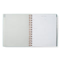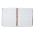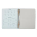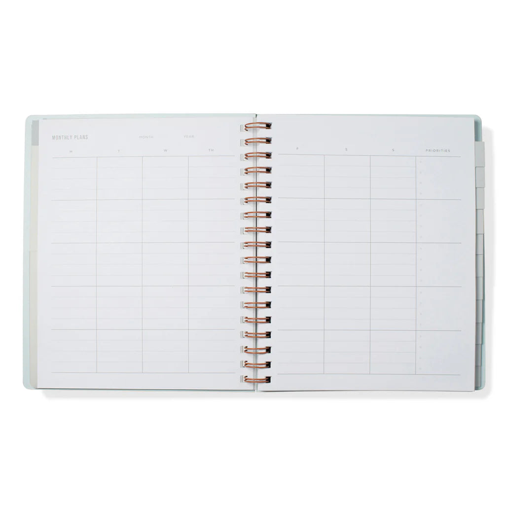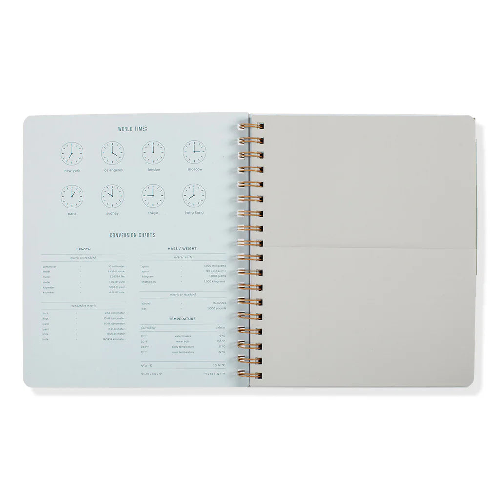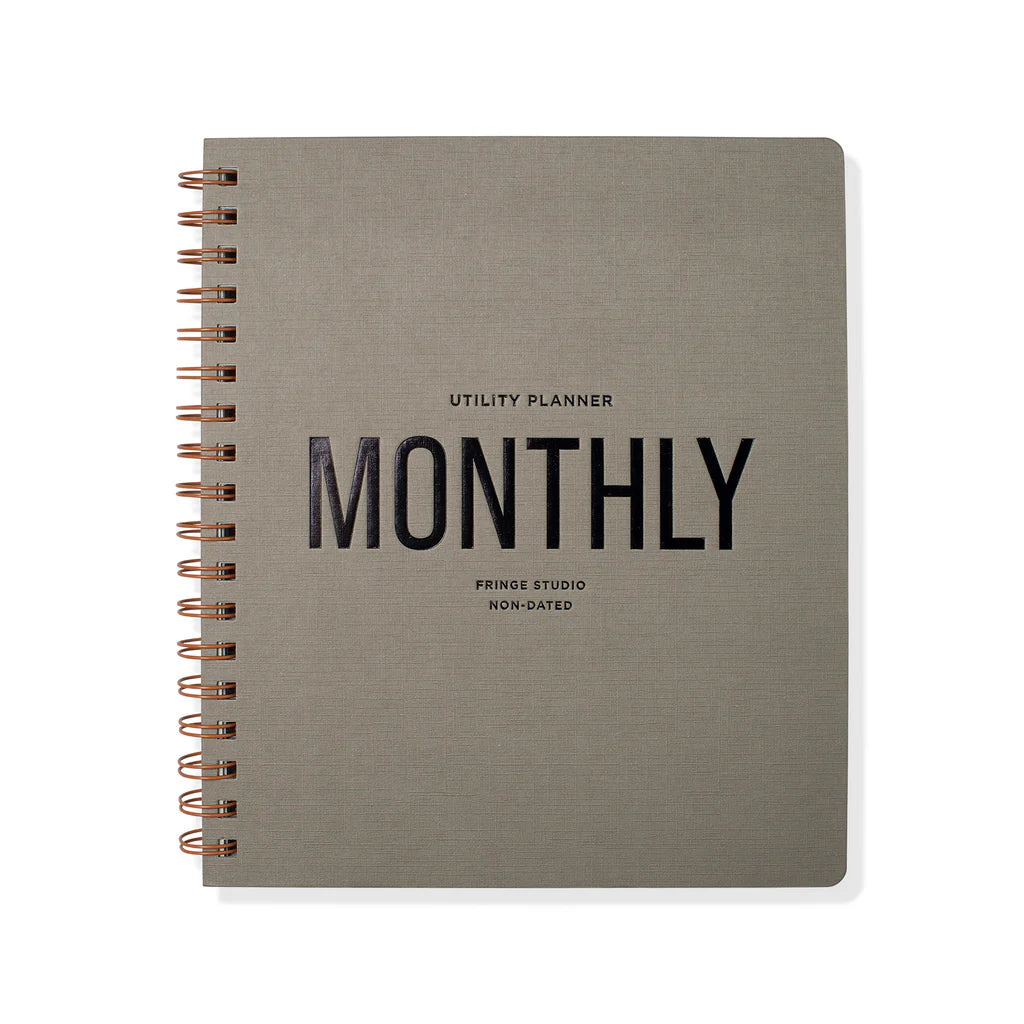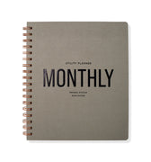 Non-dated monthly planner with textured paper cover featuring original artwork, charcoal foil, debossed design, 12 tab dividers, monthly prompted pages, double-sided pocket, and colored twin-ring spiral binding. Interior front cover features useful conversion charts and world times. This design was inspired by utilitarian styles and analog details, with a focus on function and durability.